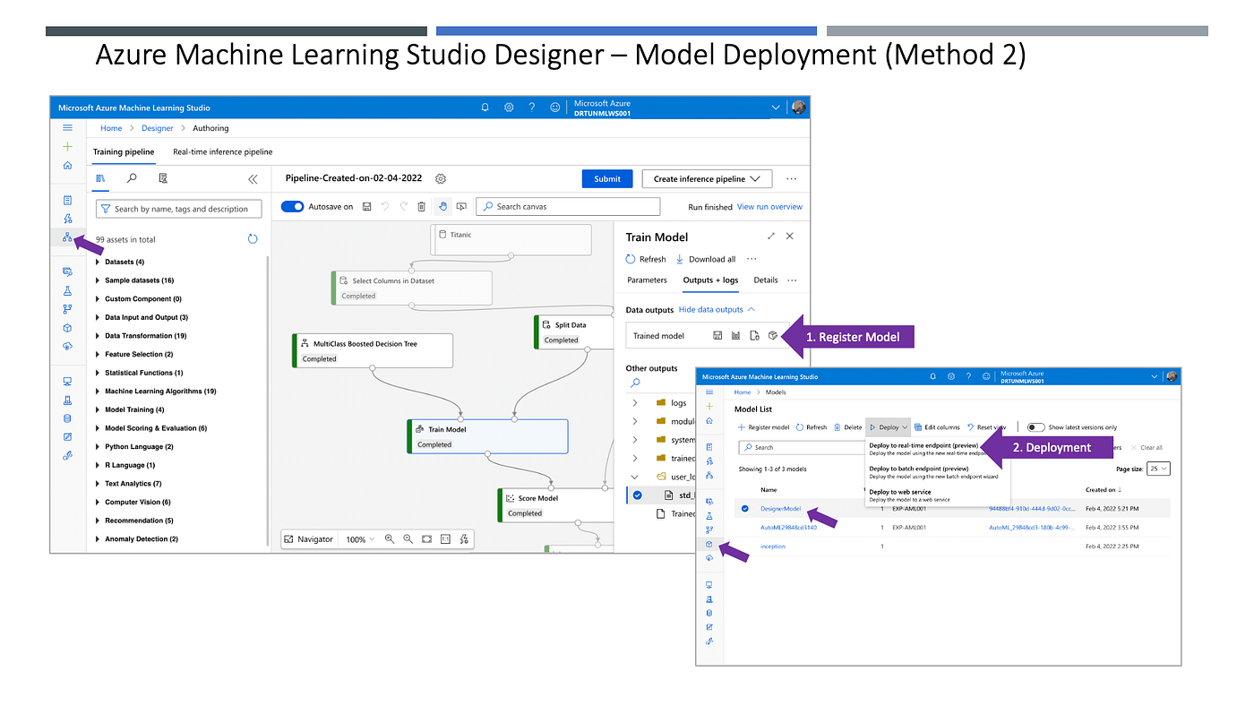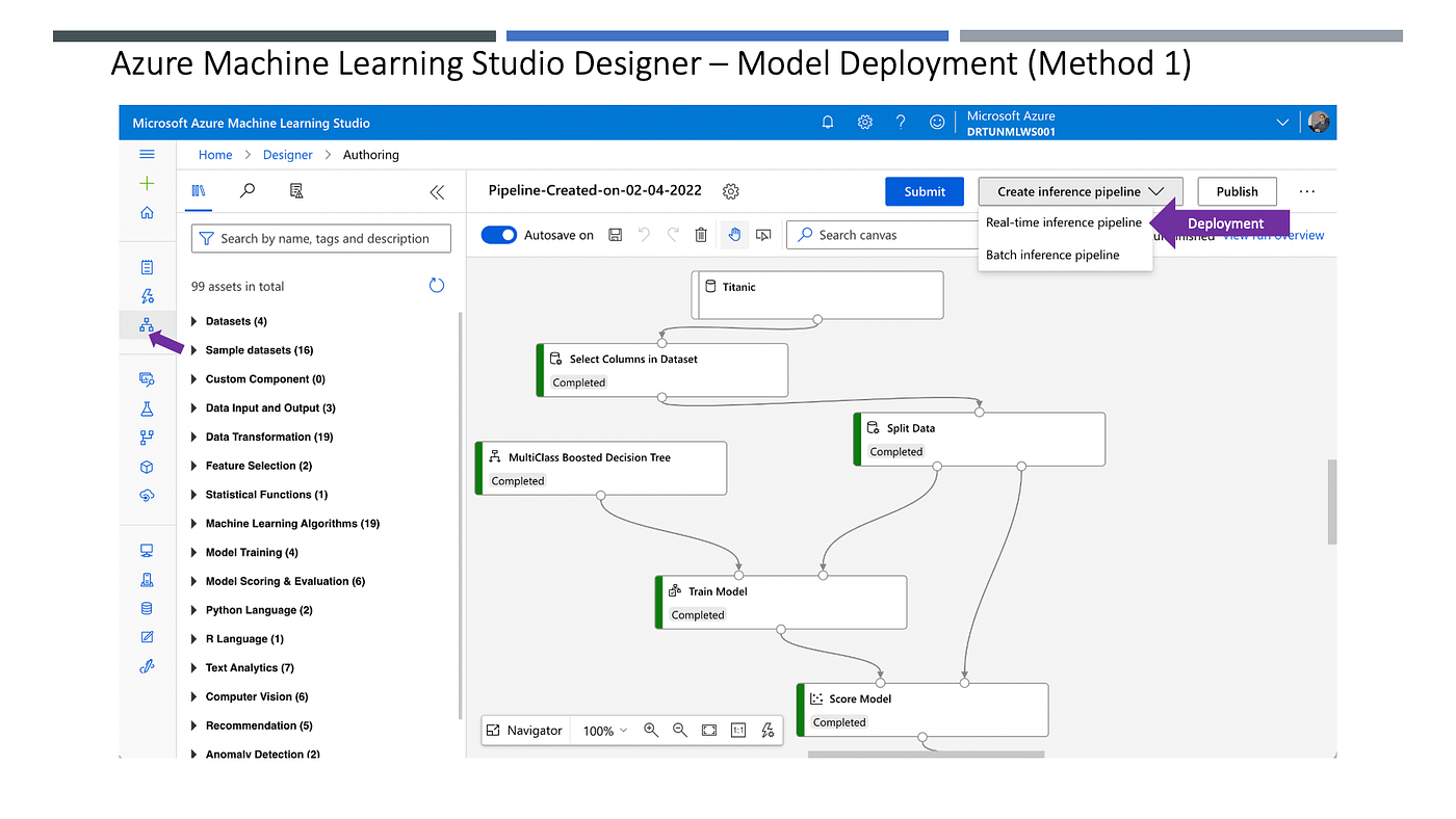 Azure ML Studio Designer အသုံးပြုလျှင် Code ရေးစရာမလိုဘဲ၊ Drag & Drop ပြုလုပ်ပြီး Data Science လုပ်ငန်းစဉ်များကို Pipelines တည်ဆောက်ပြီး Experiments များ ဆောင်ရွက်နိုင်ပါတယ်။လိုအပ်ချက်ရှိသည်အခါတွင် Code ထည့်ရေးခြင်းကိုလည်း ထည့်သွင်းဆောင်ရွက်နိုင်ပါတယ်။
