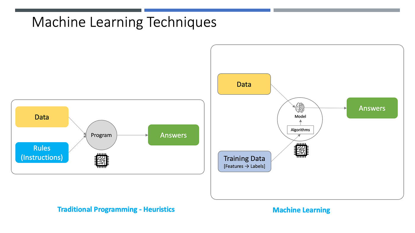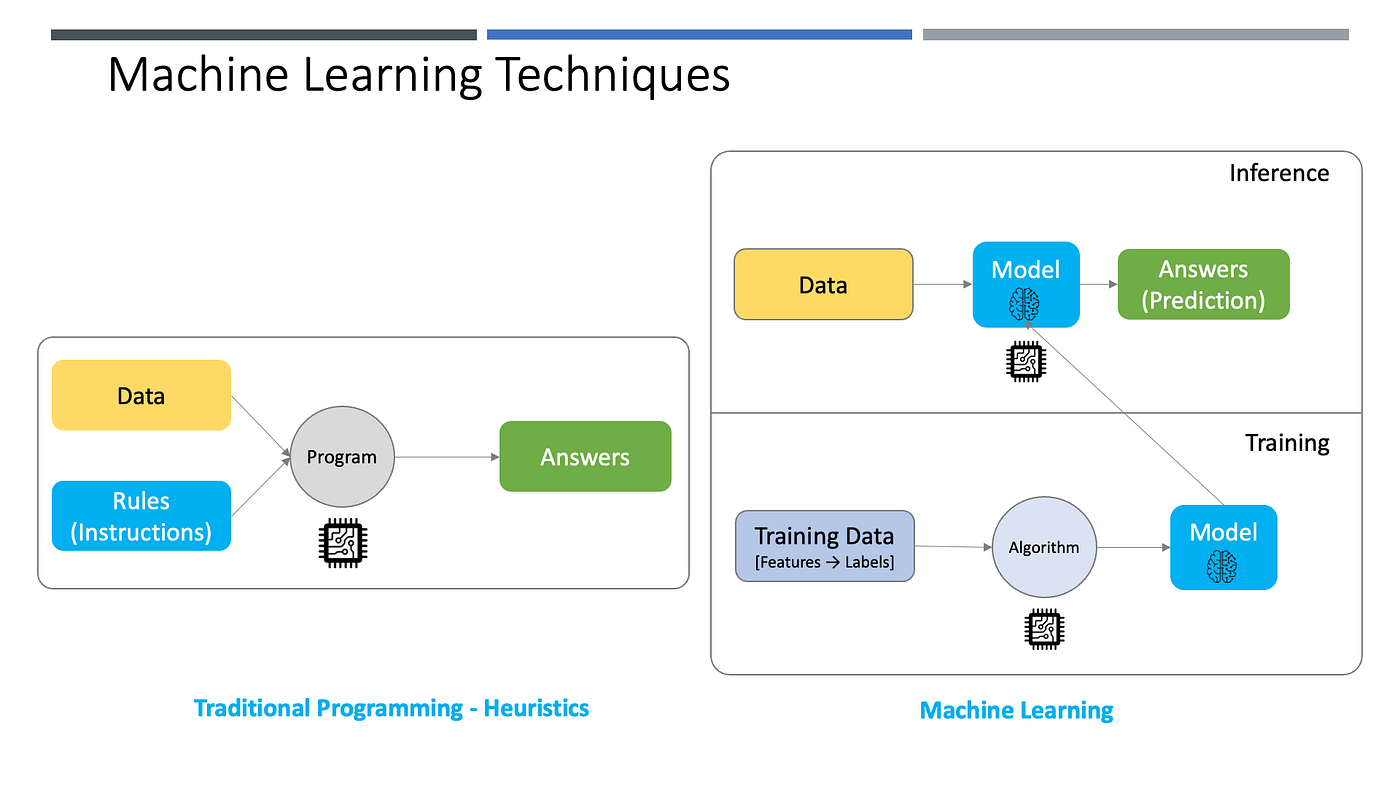 ပုံမှန် Program တွေကို ရေးသားတဲ့အခါမှာ “ဘာဆိုရင် ဘယ်လို” ဆိုတဲ့ သတ်မှတ်ချက် Rules တွေကို ရေးပေးဖို့လိုပါတယ်။ Machine Learning နည်းလမ်းကတော့ စုစည်းထားတဲ့ အချက်အလက်တွေကို ပေးရုံနှင့် Rules တွေမလိုအပ်တော့ဘဲ Model ကိုတည်ဆောက်ပေးနိုင်ပြီး၊ ဒီထွက်လာတဲ့ Model ကို အသုံးချပြီး AI စွမ်းဆောင်ရည် ရရှိနိုင်တာဖြစ်ပါတယ်။ ကွန်ပျူတာကို အချက်အလက်နဲ့ သင်ပေးတာဖြစ်တဲ့ အတွက် Training လုပ်တာလိုလည်းခေါ်ကြပါတယ်။ ဒါကြောင့် Machine Learning နည်းလမ်းလို့ ခေါ်ဆိုကြတာလည်း ဖြစ်ပါတယ်။