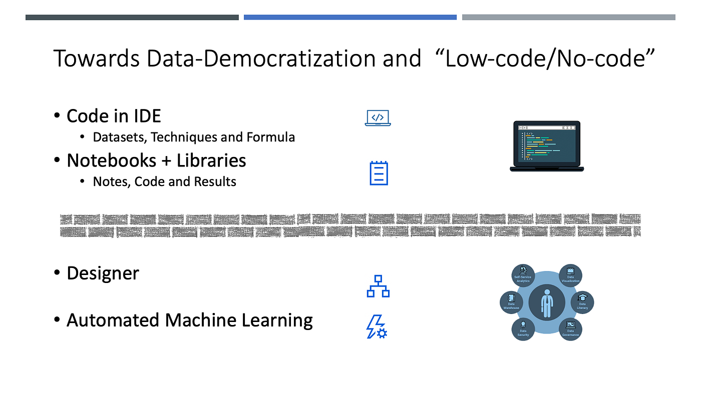 ယခုနောက်ပိုင်းတွင် Machine Learning platforms များကိုအသုံးပြုခြင်းအားဖြင့် Programming (သို့) Coding ရေးသားတတ်ရန်မလိုအပ်တော့ဘဲ Data Scicence လုပ်ငန်းစဉ်များကိုဆောင်ရွက်လာနိုင်သည်ကိုတွေ့ရပါတယ်။ Programing မရေးသားနိုင်သောသူ လူအများစုအနေဖြင့် အချက်အလက်များကို အသုံးချလာနိုင်ကြပြီး Data Science လုပ်ငန်းစဉ်များကို လုပ်ဆောင်နိုင်သည့်အတွက် Data Democratization ဟုလည်း တင်စားခေါ်ဝေါ်ကြပါသည်။