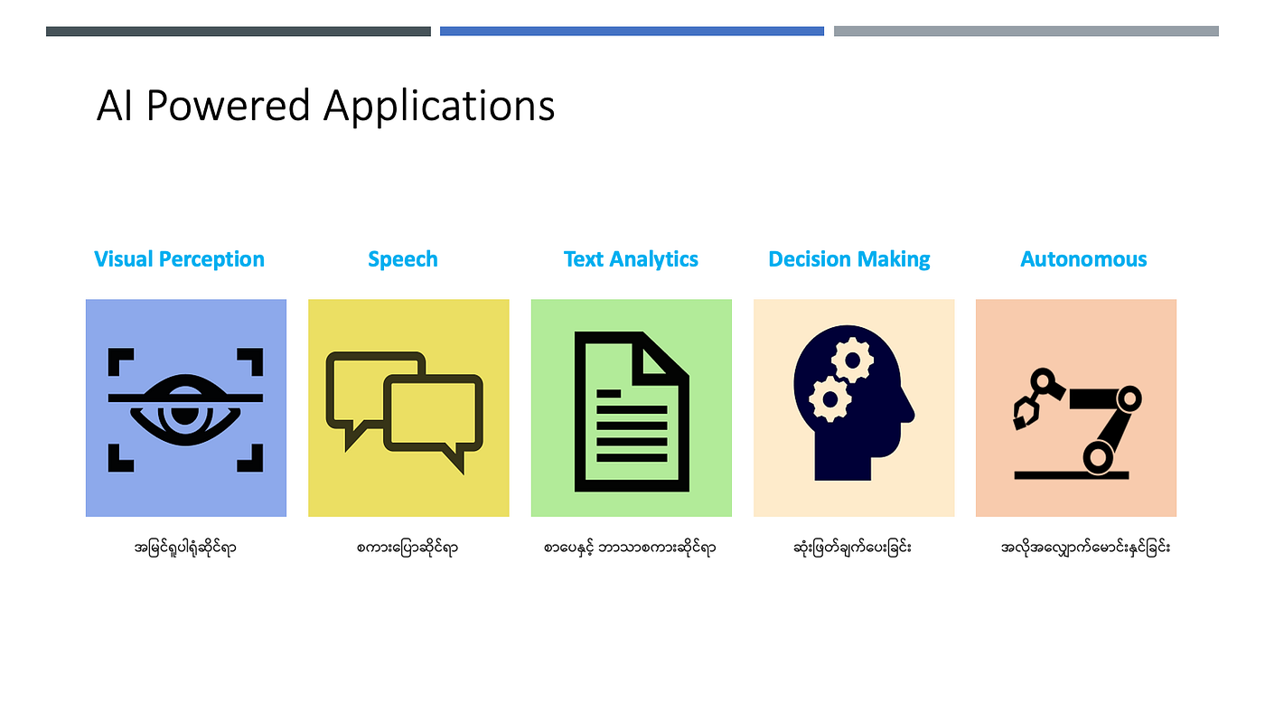 AI ကို အသုံးပြုကြတဲ့ အသုံးပြုမှုကဏ္ဍများနဲ့ စတင်အကောင်အထည်ဖေါ်လို့ရမည့် ပုံစံတွေဖြစ်ပါသည်။