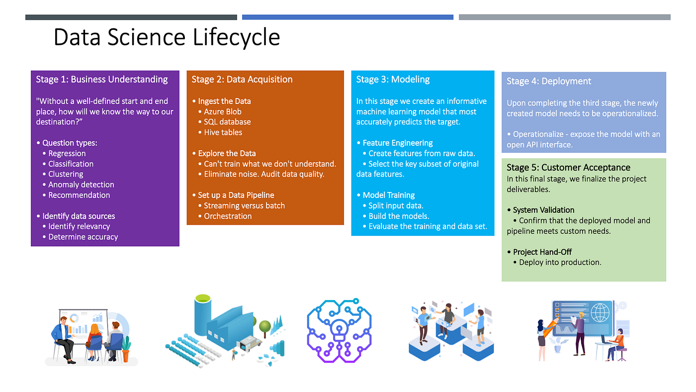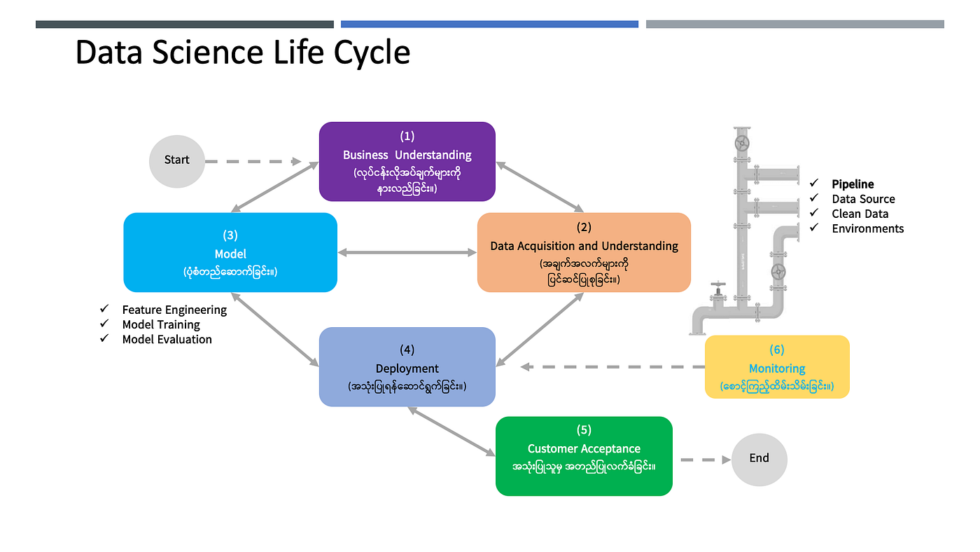 Data Science Life Cycle ဆိုတာကတော့ Data Science လုပ်ငန်းစဉ်ကို အဆင့်ဆင့် ဆောင်ရွက်ခြင်း၊ လည်ပတ်ခြင်းဖြစ်စဉ် လို့ပြောရပါမယ်။