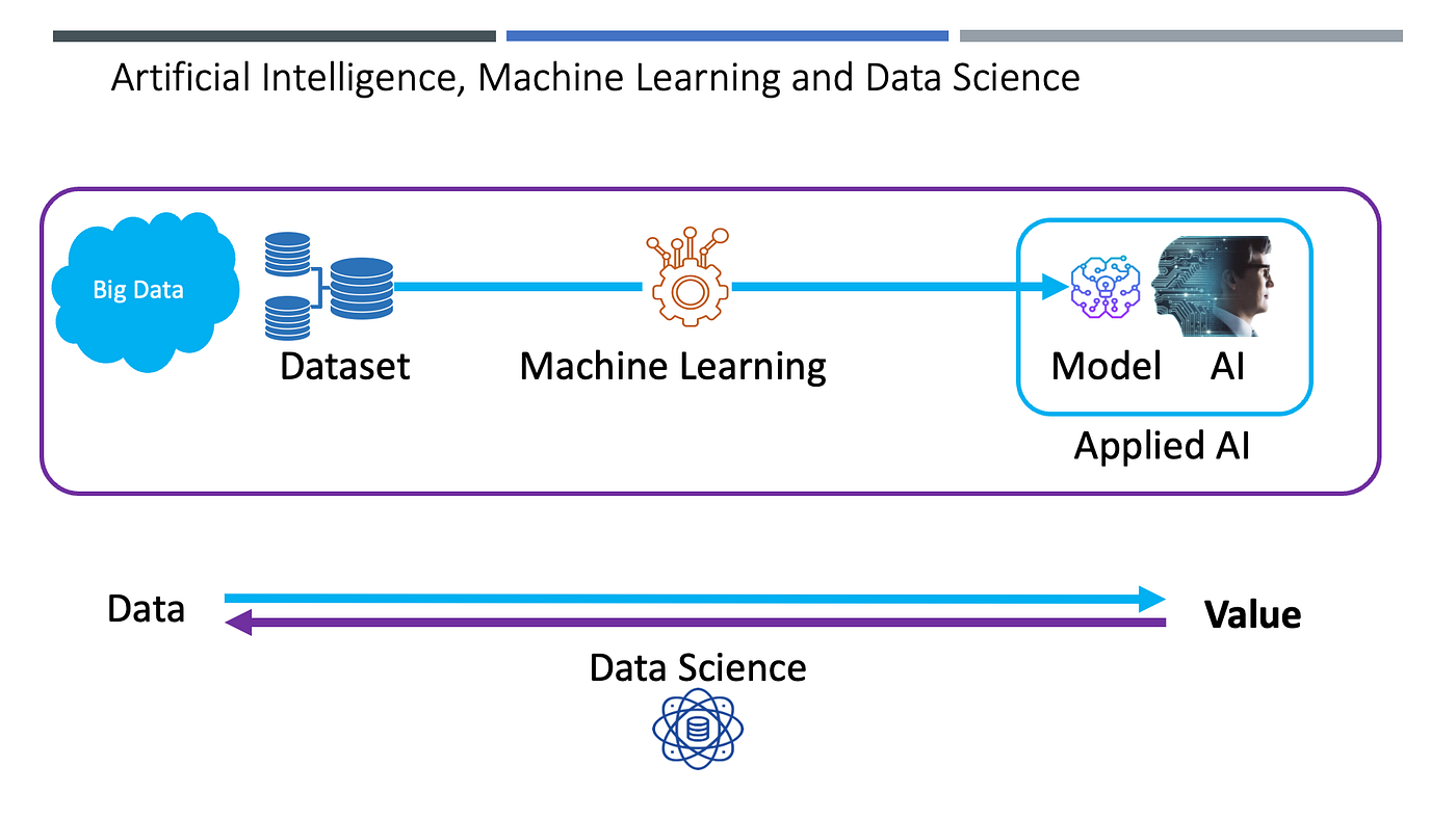 Data Science (အချက်အလက်သိပ္ပံ) လို့ ပြောရင်ကျယ်ပြန့်ပါတယ်။ယေဘုယျအားဖြင့်တော့ အချက်အလက်များကို စာရင်းအင်းနှင့် သိပ္ပံပညာနည်းလမ်းတွေသုံးပြီ တန်ဖိုးထုတ်ယူခြင်းလို့ ဆိုပါတယ်။ Machine Learning (စက်လေ့လာမှု) ဆိုတာကတော့ စုစည်းထားတဲ့အချက်အလက်တွေကို အသုံးချပြီး AI စွမ်းဆောင်ရည်ရယူခြင်း နည်းလမ်းတစ်ခု ဖြစ်ပါတယ်။ AI (ဉာဏ်ရည်တု) ဆိုတာကတော့ လူသားတွေမှာရှိကြတဲ့ ပြဿနာဖြေရှင်းနိုင်စွမ်းတွေ၊ ဆုံးဖြတ်နိုင်စွမ်းတွေ၊ သိမြင်နိုင်စွမ်းတွေကို ကွန်ပျူတာဖြင့် အတုယူ စွမ်းဆောင်ခြင်း ဖြစ်ပါတယ်။