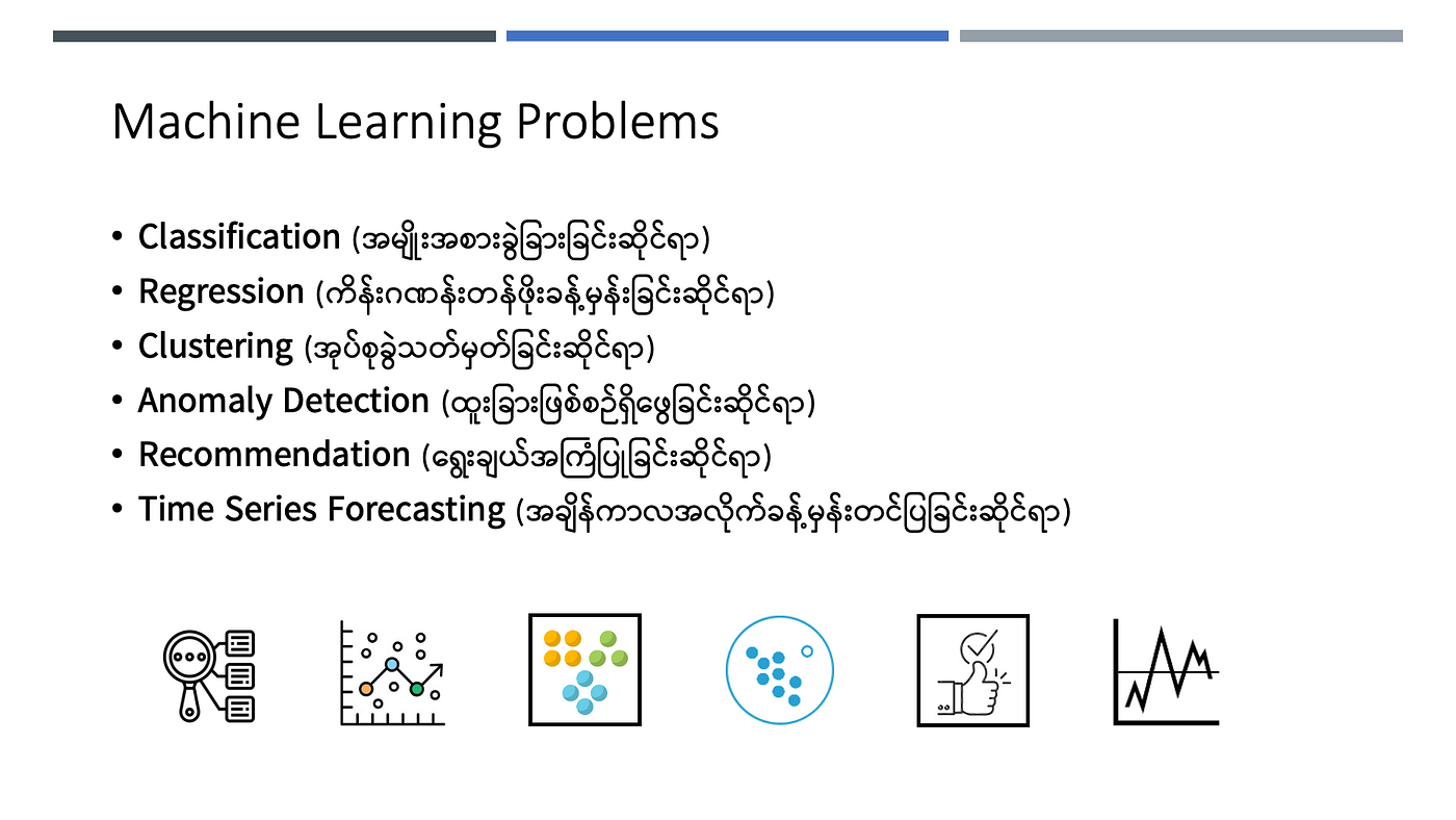 Data Science လုပ်ငန်းစဉ်အစမှာ ပထမဦးဆုံးအနေဖြင့် အကောင်အထည်ဖေါ်ဖြေရှင်းရမဲ့ ရည်မှန်းချက်၊ ပြဿနာ (သို့) ပုစ္ဆာအမျိုးအစားတွေကို ခွဲခြားတတ်ဖို့လိုအပ်ပါတယ်။