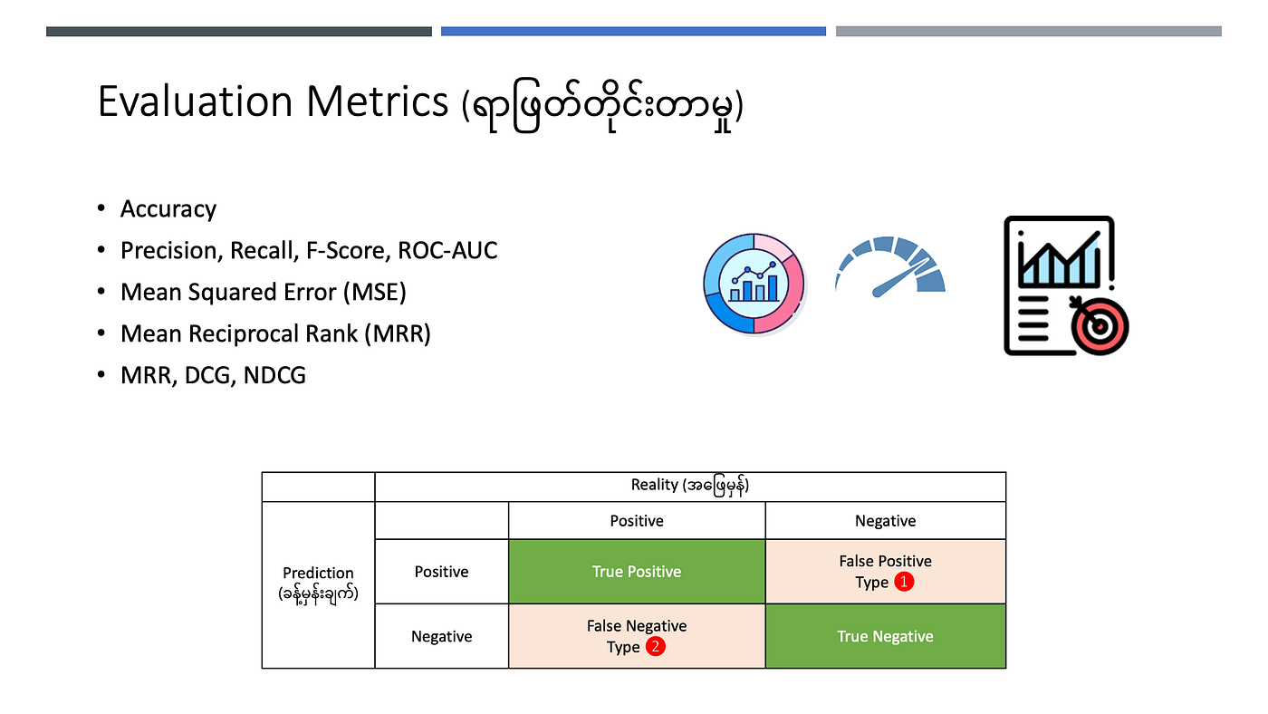 Model ၏ စွမ်းဆောင်နိုင်ရည် တိုင်းတာရာတွင် ပုစ္ဆာအမျိုးအစားပေါ်မူတည်၍ တိုင်းတာမှု Metric ကွဲပြားမှုရှိပါသည်။ Classification ကိုအသုံးပြုမဲ့ တိုင်းတာမှုနဲ့ Regression ကိုအသုံးပြုမဲ့ တိုင်းတာမှု မတူပါဘူး။ Accuracy, Precision, Recall, AUC တို့ကို Classification ပုစ္ဆာတွေမှာ သုံးပြီးတော့ MSE ကို Regression ပုစ္ဆာတွေမှာ အသုံးပြုကြပါတယ်။ Training Dataset တွင်နဲ့စမ်းရင် အောင်မြင်ပေမဲ့ တခြားပြင်ပ Dataset များနှင့် အသုံးပြုတဲ့အခါ မှားယွင်းတတ်တာကို Overfitting ပြဿနာလို့ ခေါ်ဆိုပါတယ်။ Model က Training Dataset ကို လှေနံဓါးထစ် မှတ်သားထားတဲ့ သဘောမျိုးဖြစ်ပါတယ်။ Underfitting ပြဿနာဆိုတာကတော့ Tranining Dataset ကိုတောင် အောင်မြင်အောင် မခန့်မှန်းနိုင်တာကို ဆိုလိုပါတယ်။