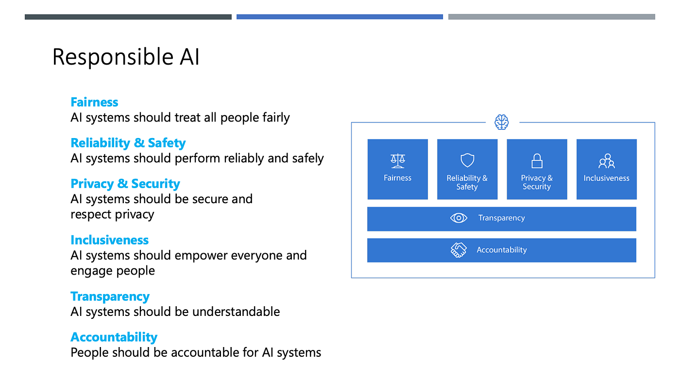 အခုနောက်ပိုင်း အရေးကြီးသည့်အတွက် ပြောလာကြတာကတော့ Responsible AI ပဲဖြစ်ပါတယ်။ တရားမျှတမှုရှိခြင်း၊ အများပါဝင်နိုင်ခြင်း၊ ပွင့်လင်းမြင်သာမှုရှိခြင်း၊ ကိုယ်ပိုင်အချက်အလက်တွေကို ကာကွယ်ပေးနိုင်မှုနှင့်လုံခြုံမှုရှိခြင်း၊ စိတ်ချခိုင်မာမှုရှိခြင်း၊ တာဝန်ခံယူမှုရှိခြင်းတို့ကို အားလုံး သေသေချာချာ စီစဉ်ဖို့ လိုအပ်ပါတယ်။
