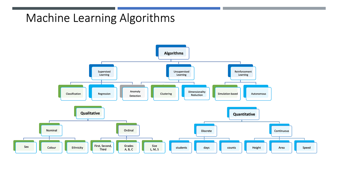 Machine Learning တွင်အသုံးပြုမည့် အချက်အလက်များကို Qualitative Data (အရည်အသွးအခြေခံသောအချက်အလက်) နှင့် Quantitative (အရေအတွက်အခြေခံသောအချက်အလက်) ဟူ၍ခွဲခြားထားပါတယ်။ Qualitative Data (အရည်အသွးအခြေခံသောအချက်အလက်) ကို ထပ်မံ၍ Ordinal Data (စဉ်၍ရသော အချက်အလက်) နှင့် Nominal (စဉ်၍မရသောအချက်အလက်) ဟူ၍ လည်းကောင်း၊ Quantiative Data(အရေအတွက်အခြေခံသောအချက်အလက်) ကိုလည်း ထပ်မံ၍ Discrete Data (ကိန်းပြည့်အချက်အလက်) နှင့် Continuous Data (ကိန်းစစ်အချက်အလက်) ဟူ၍ လည်းကောင်း အမျိုးအစားခွဲခြားသတ်မှတ်နိုင်ပါတယ်။