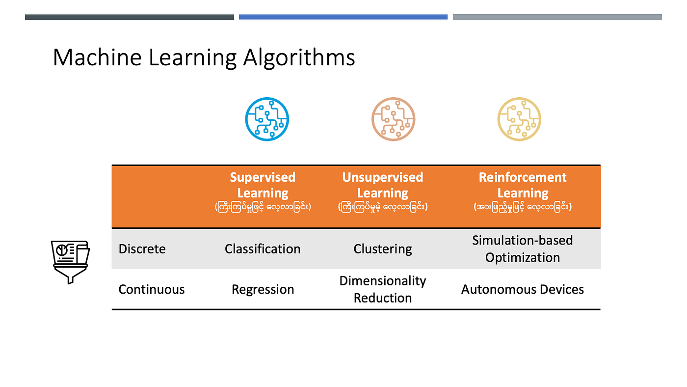 Machine Learning လုပ်တဲ့ Algorithms နည်းစနစ်တွေ များစွာရှိပါတယ်။ Linear Regression တို့၊ Vectorization ကိုအခြေခံတဲ့ နည်းစနစ်တွေ၊ Decision Tree တို့၊ Random Forest တို့၊ Deep Learning နည်းစနစ်တွေ များစွာရှိပါတယ်။ နောက်ပိုင်းခေတ်စားလာတာ ကတော့ Ensemble လို့ခေါ်တဲ Algorithms တစ်ခုမကကို ထပ်ဆင့်သုံးတဲ့ နည်းလမ်းတစ်မျိုး ဖြစ်ပါတယ်။